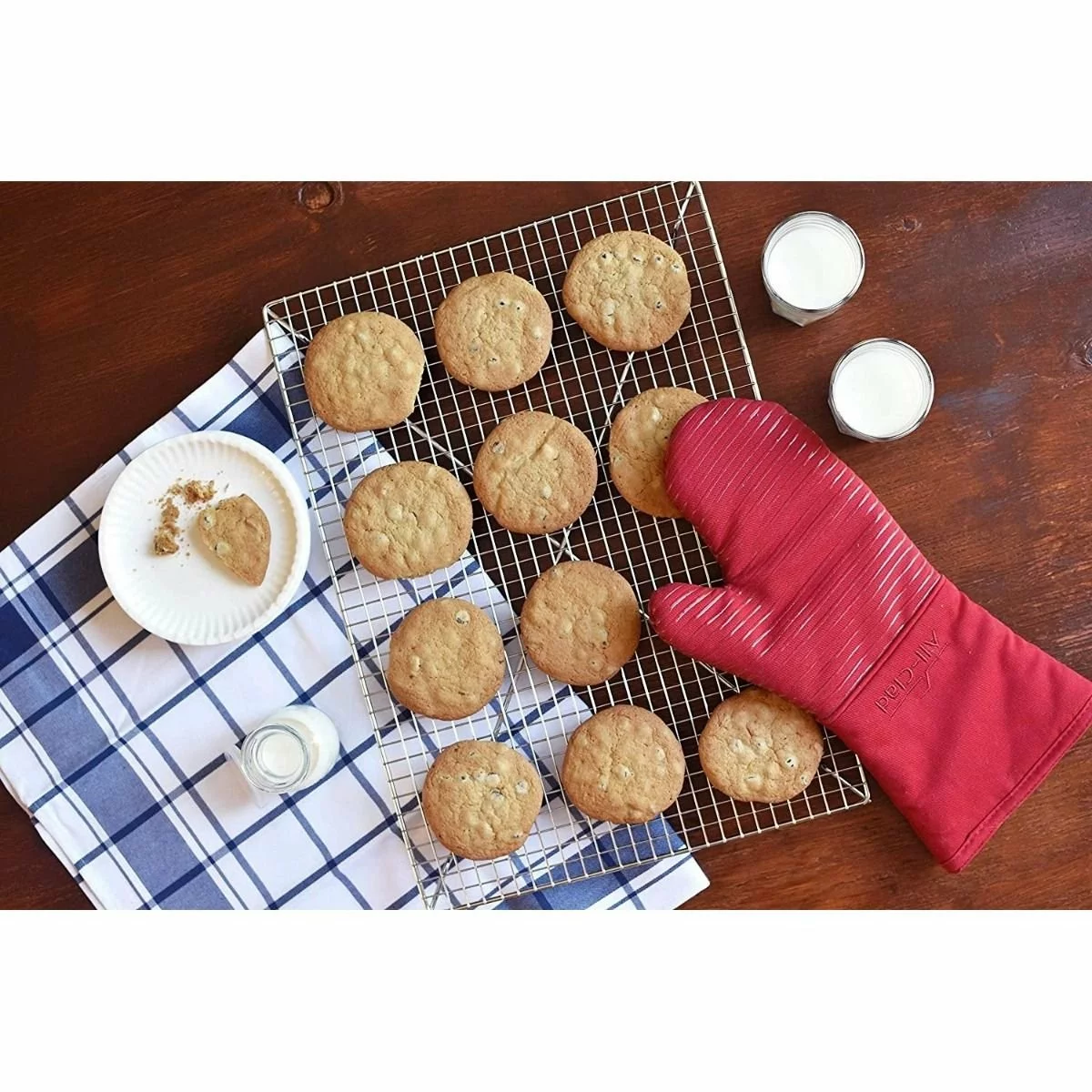 - Silicone Oven Mitt — made of heavyweight twill and silicone; heat resistant to 500°F