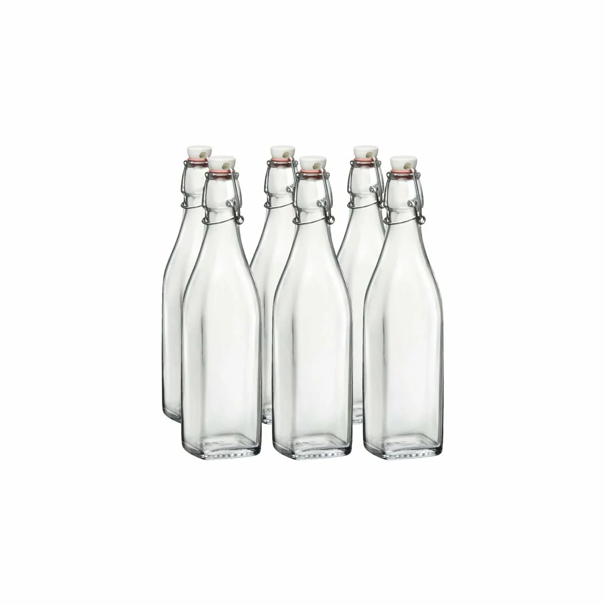 High-quality Italian glass and a classic design makes this 6-pack of Bormioli Rocco 17oz Swing Top Glass bottles a beautiful solution for storing or gifting your homemade infused vinegars, rich syrups, or flavored liqueurs. The hermetically sealing swing-top lid creates a leak-proof seal for storage or travel, and the sturdy glass construction makes the bottles both durable and practical. Bottles are dishwasher safe, but wire swing-top should be hand-washed.