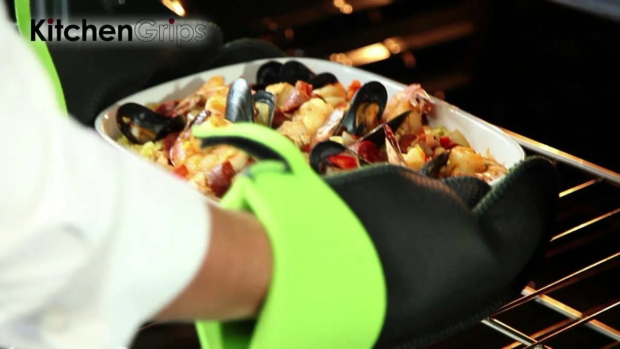 Get the mitt that fits! Kitchen Grips’ Mitts offer both dexterity and safety for your kitchen. Poorly fitted mitts are awkward, clumsy, and unsafe. Kitchen Grips are built to fit your hand comfortably while keeping your hands safe from direct heat contact. Comprised of our FLXaPrene™ material and Kevlar® stitching, the combined materials prevent stains that cause bacteria buildup on your mitt, while the Kevlar® stitching ensures the seams of the mitt will not melt under high heat. Kitchen Grips’ famous non-slip grip has a raised nub surface pattern and is engineered to provide a better and safer grip, while also being water-repellent, stain-resistant, and dishwasher safe.