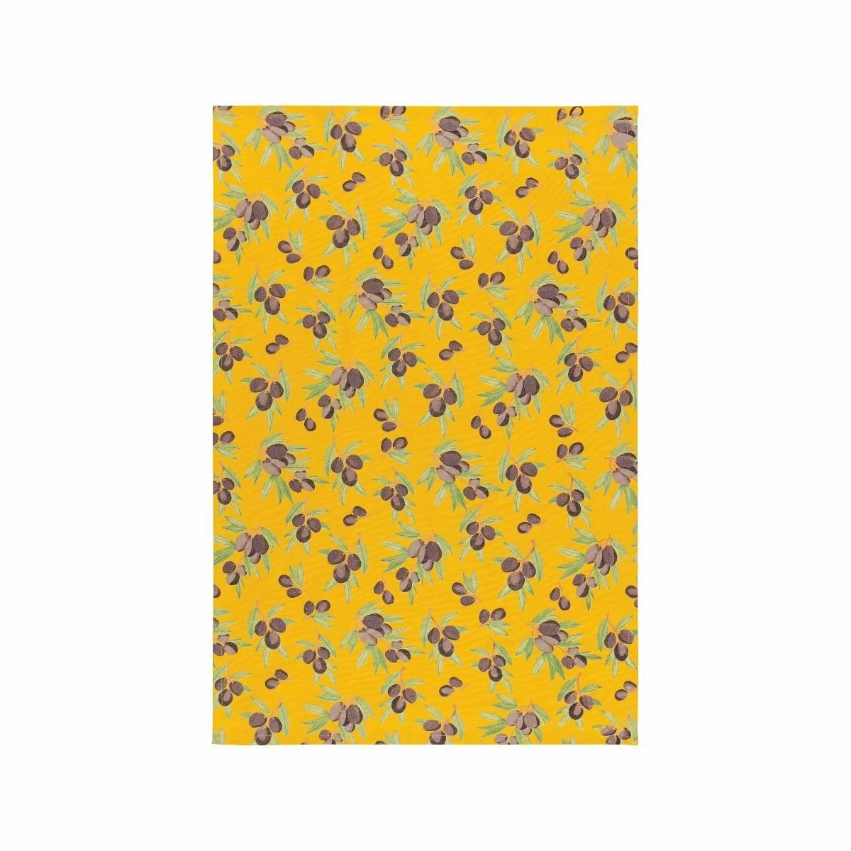 - Olive design features illustrated olives dancing across a yellow background