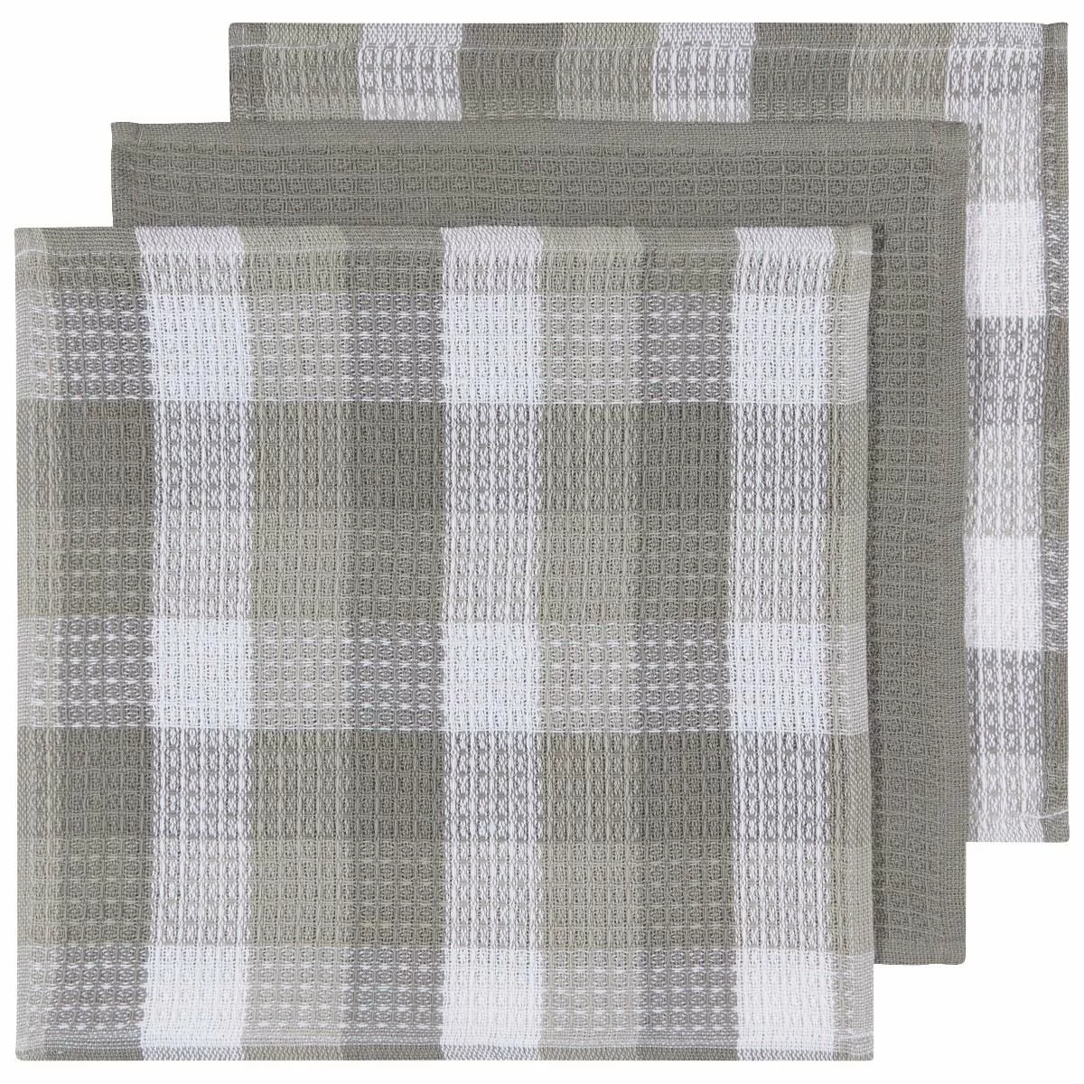 - Includes three waffle-weave dishcloths in classic neutral tones of gray, taupe & white