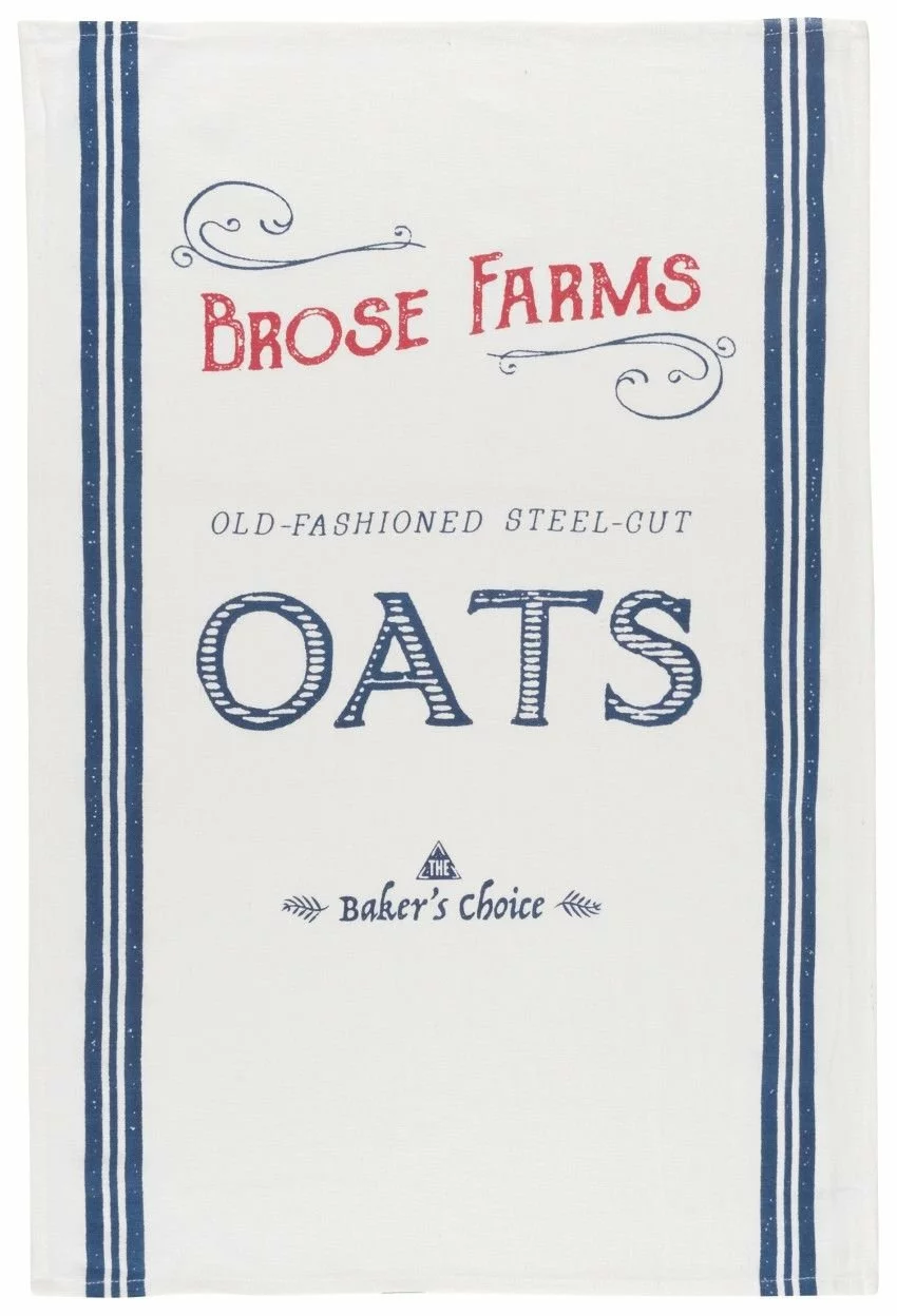 - Includes 3 floursack towels, each featuring an old-fashioned dry goods design