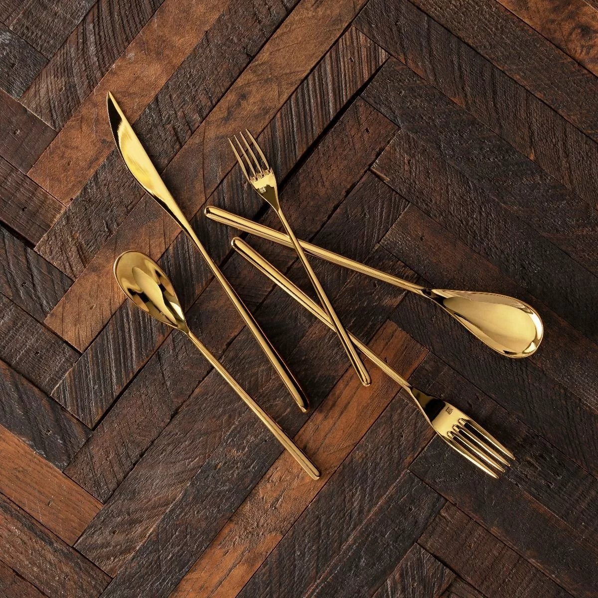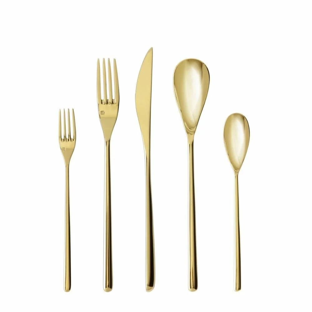 Make a statement with the Fortessa Dragonfly 5pc Place Setting in Gold! This stunning flatware set features a unique slender design and mirrored gold finish that draws the eye. Two droplet-shaped spoons, two sleek forks, and a delicately-sloped knife make up this set, all with elongated round handles. These sophisticated pieces have the perfect amount of heft and balance, making them feel high-quality and comfortable to use. Made from 18/10 stainless steel, this flatware set is dishwasher-safe. Whether you’re hosting a party, setting up a dinner date, or serving yourself, add functional beauty to the table with the Fortessa Dragonfly 5pc Place Setting in Gold!