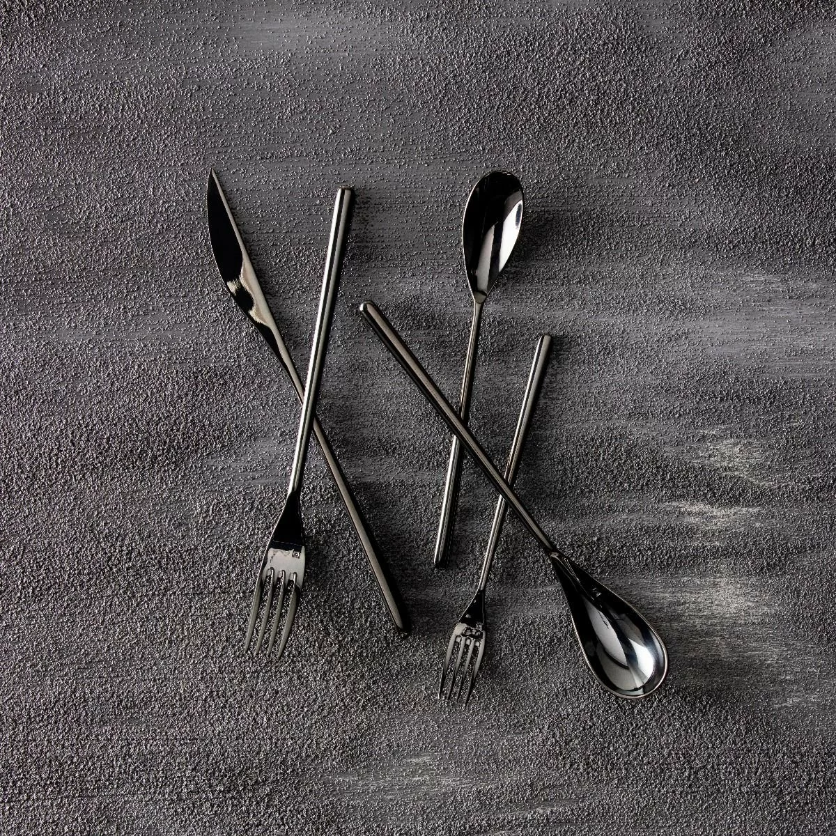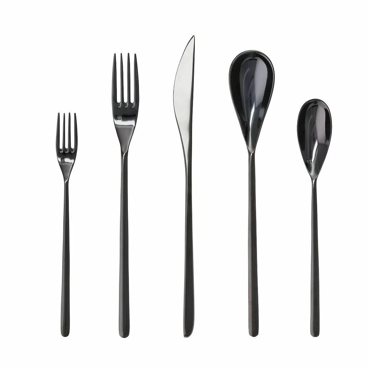 Make a statement with the Fortessa Dragonfly 5pc Place Setting in Black! This stunning flatware set features a unique slender design and mirrored black finish that draws the eye. Two droplet-shaped spoons, two sleek forks, and a delicately-sloped knife make up this set, all with elongated round handles. These sophisticated pieces have the perfect amount of heft and balance, making them feel high-quality and comfortable to use. Made from 18/10 stainless steel, this flatware set is dishwasher-safe. Whether you’re hosting a party, setting up a dinner date, or serving yourself, add functional beauty to the table with the Fortessa Dragonfly 5pc Place Setting in Black!