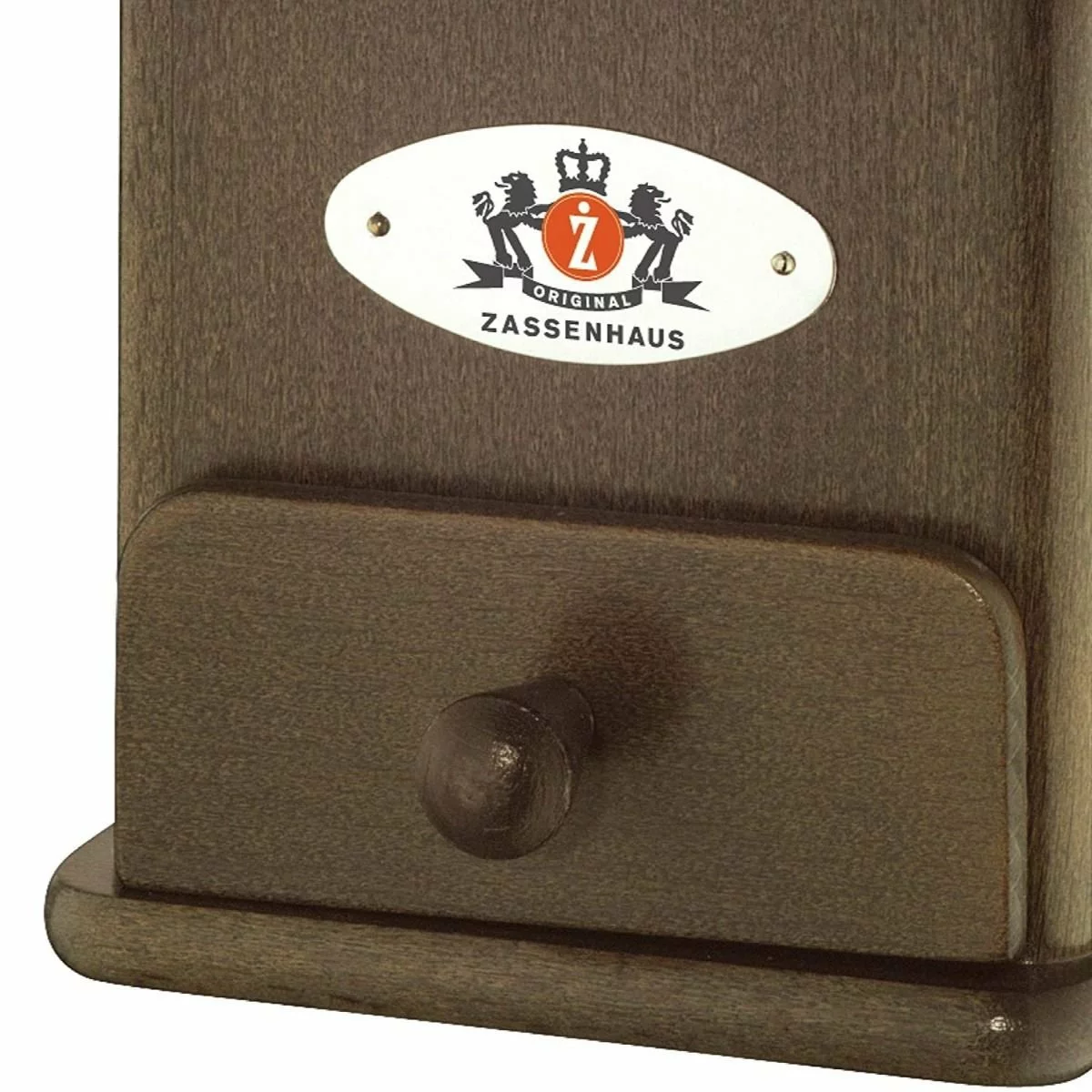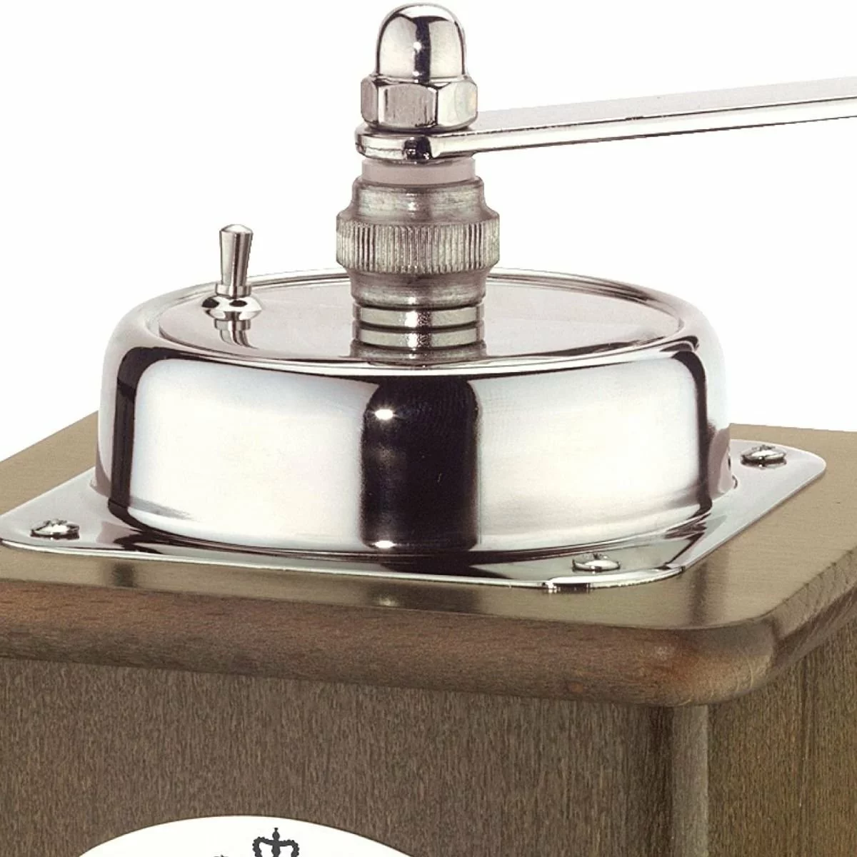 - Chrome-finished carbon steel conical burr grinder with an attractive beechwood frame