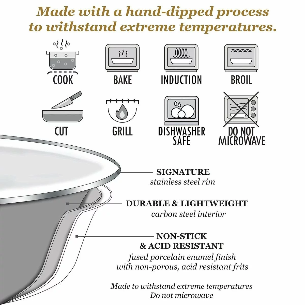 - Oven safe for baking and broiling