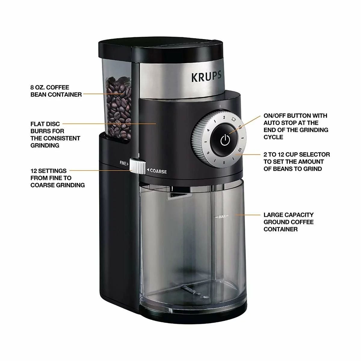 There’s nothing like the smell of freshly ground coffee in the morning. The KRUPS 12-Cup Burr Grinder lets you enjoy the lingering smell of your favorite blend that you’ll soon turn into a satisfying cup of coffee. Regardless of your style – Espresso, French Press, Drip, Pour Over – this highly reliable electric grinder will fine-tune your coffee with 12 grind settings ranging from fine to coarse. Dark roast to light, Arabica bean to Excelsa, Ethiopian origin to Brazilian, the flat burr grinding disks will maximize your coffee’s flavor profile. Packed with convenient features, the cup selector allows you to choose between 2 to 12 cups, while the auto-stop function provides full control and safety. Additionally, a large capacity, 8-ounce whole coffee bean hopper and removable grounds container possess the capacity to produce grinds for up to 30-32 cups of coffee. Keeping your grinder clean is essential to achieve the best results in terms of taste. The removable top burr with an embedded cleaning brush allows for smooth and easy cleaning. KRUPS designs robust and precise products that are a pleasure to use, enabling you to achieve the detail in your coffee making that makes all the difference.Â