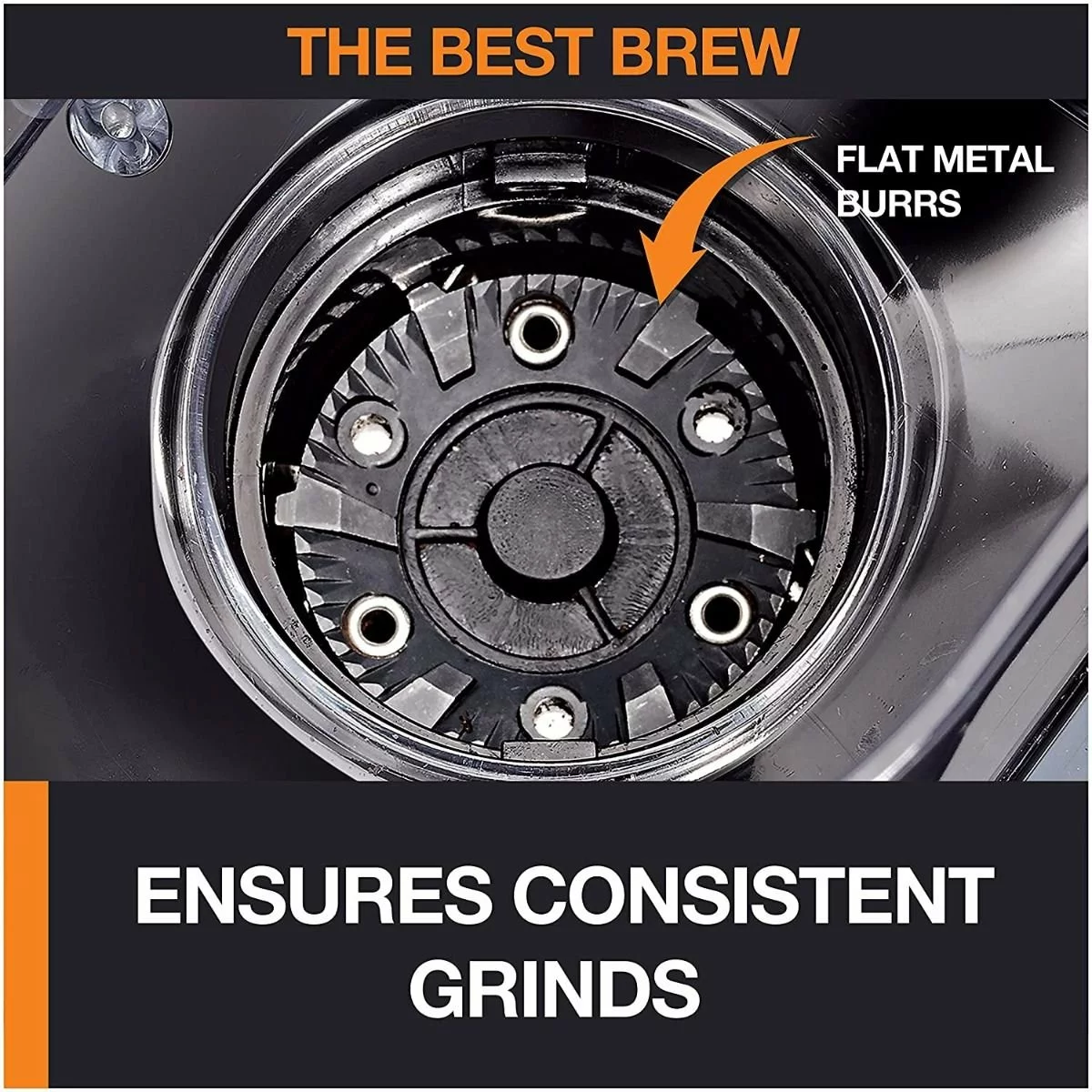 - Metallic flat burr coffee grinder provides full control over grind size and uniform grinding for full flavor