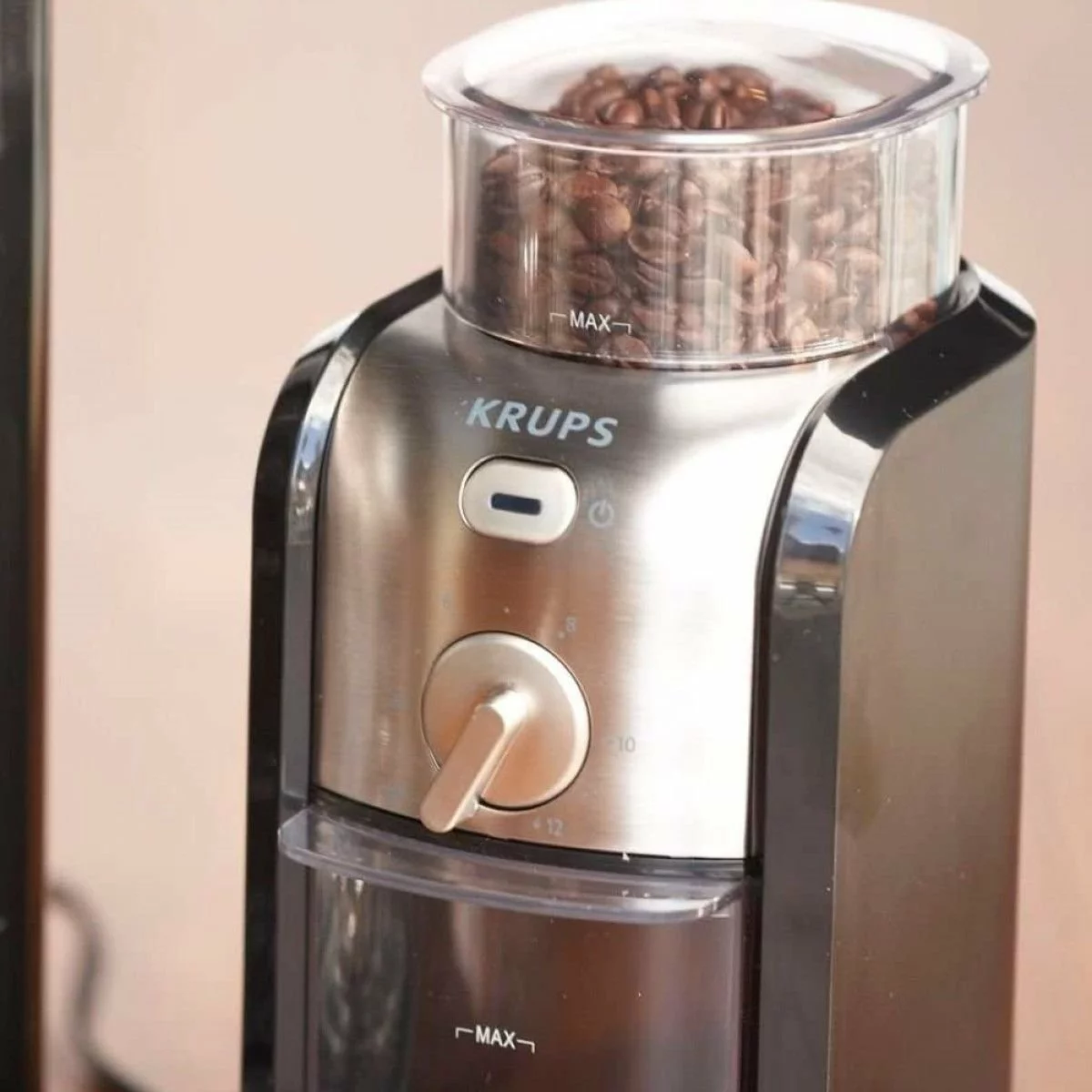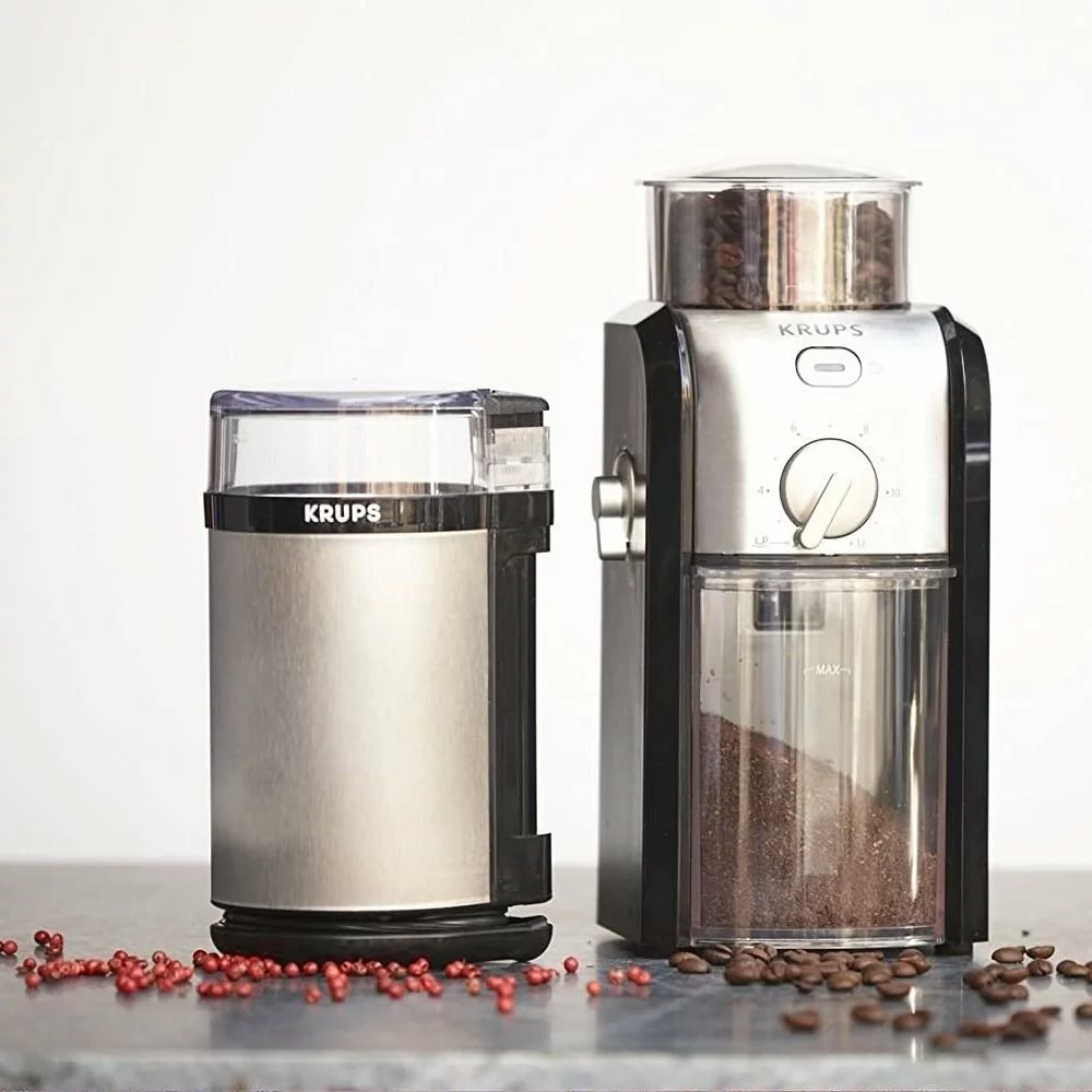 It has been said that the best part of waking up is coffee in your cup. That’s especially so if you’ve ground that personally selected coffee by hand, custom crafting it to your flavor preferences. The KRUPS Conical Burr Grinder is a tool that enables you to do just that. An affordable grinder designed for home use, this compact and practical grinder is equipped with a burr milling system to reduce heat transfer and preserve your favorite blend’s flavor and aroma. Designed with versatility in mind, you’ll find 17 grind settings that are ideal for all brew methods from espresso to drip coffee to french press. More than one person to make coffee for? No problem. The selectable 2-12 cup option shuts off automatically after your designated quantity has been achieved. Your whole beans will be kept fresh in the 8oz air-tight bean hopper that fills smoothly and provides easy access to the removable burrs for cleaning with the included brush. As a safety precaution, the burr grinder will not operate unless the hopper and coffee container lids are in place. Measuring 6.1 L x 4.5″ W x 10.2″ H, this must-have tool for any true coffee lover will enhance your morning!Â