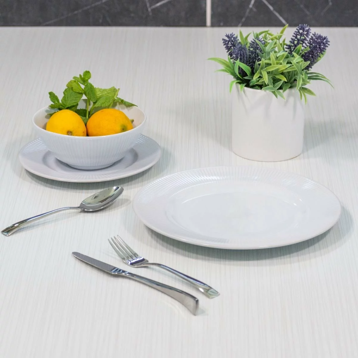 Bring a simple, sophisticated style to your table with the Mason Cash Linear Collection 18-Piece Dinnerware Set. The Linear Collection features an embossed design for a stylish, contemporary look that’ll complement any kitchen aesthetic. This set includes six 10” dinner plates, six 8” salad plates, and six 20 oz. cereal bowls. Each piece is crafted from durable, high-quality stoneware that’s microwave and dishwasher-safe for easy cleaning. From rustic to modern kitchen styles, this stunning dinnerware set can be used daily or pulled out for special occasions. For timeless dinnerware that you’ll use for years to come, try the Mason Cash Linear Collection today!