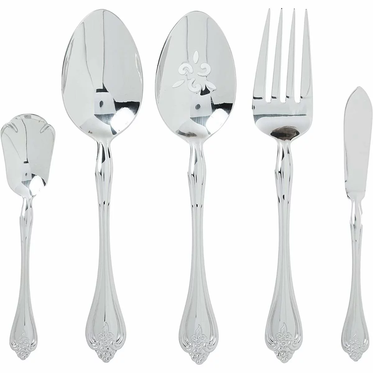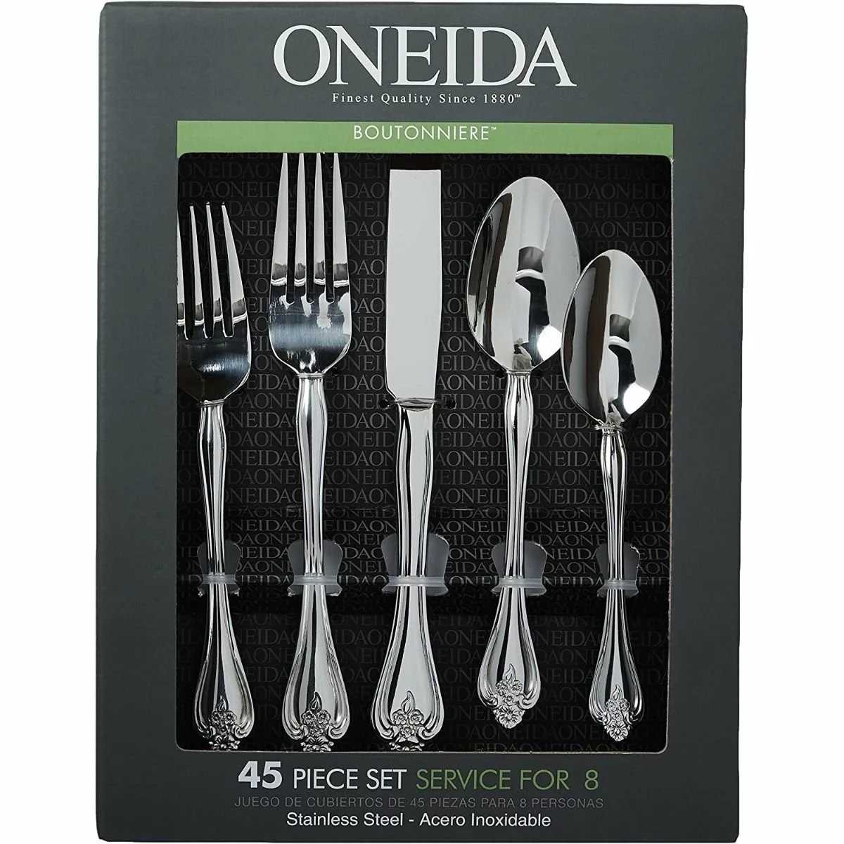 Elevate your dining table with the Boutonniere 45-Piece Flatware Set from Oneida. Constructed from the highest quality 18/0 steel, this flatware set is rust-proof, dishwasher-safe and guaranteed to last with a lifetime warranty. This set features decorative floral handles for an elegant, formal design that will make any occasion special. Included with this set is a full service for eight, two serving spoons, a sugar spoon, a sugar fork and a butter knife. All the pieces are dishwasher safe for easy cleanup. For a place setting that brings sophistication and style to your table, order your Oneida Boutonniere 45-Piece Flatware Set today.Â