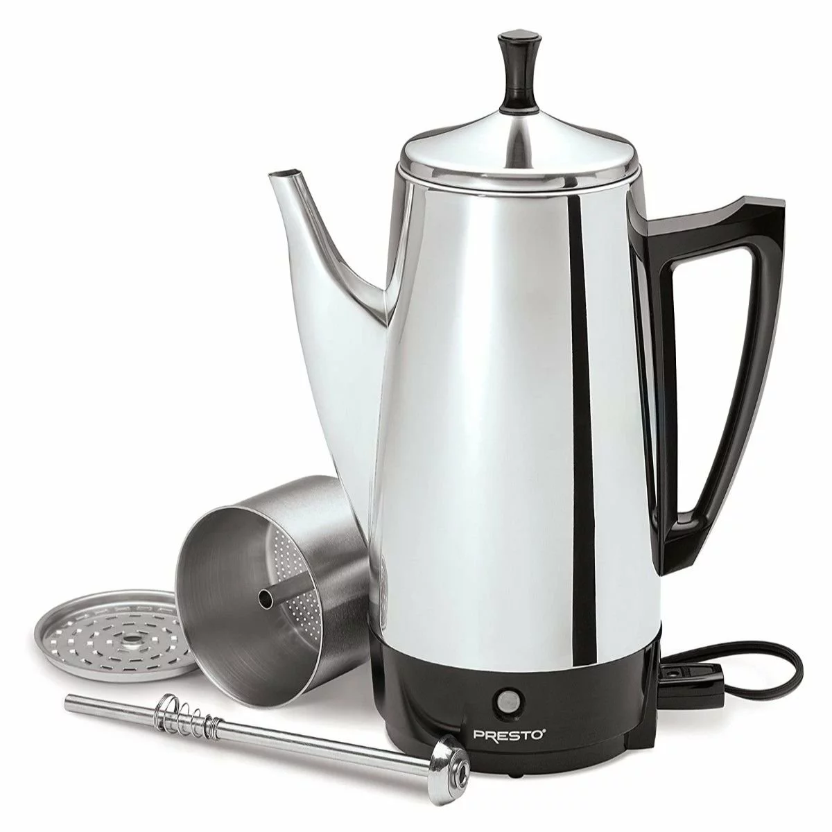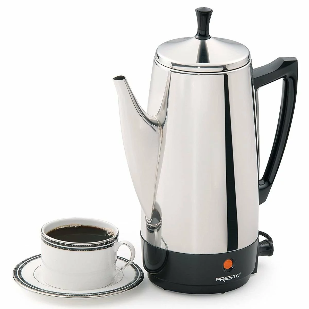Percolating coffee makers have a long and storied tradition of consistent quality, and are well known for brewing strong coffee. This percolating coffee pot comes with a filter basket and a perk tube, all made of durable stainless steel with a beautiful, classic silver finish and a traditional shape. The easy-pour spout makes it easy to avoid spills and messes and the electric element features a simple signal light alerts you when the coffee is ready to serve! The pot will automatically stay hot after brewing to keep your coffee steamy.
