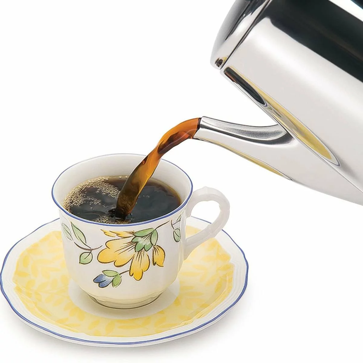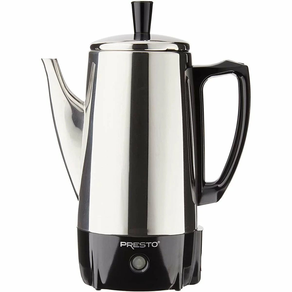 Percolating coffee makers have a long and storied tradition of consistent quality, and are well known for brewing strong coffee. This percolating coffee pot comes with a filter basket and a perk tube, all made of durable stainless steel with a beautiful, classic silver finish and a traditional shape. The easy-pour spout makes it easy to avoid spills and messes and the electric element features a simple signal light alerts you when the coffee is ready to serve! The pot will automatically stay hot after brewing to keep your coffee steamy.