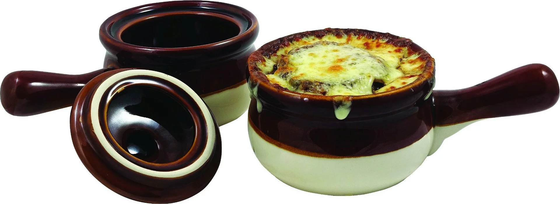 Family recipes for soup and the methods involved in preparing them back in the good ole days are sophisticated and effective when used with cookware like the 15-Ounce Ceramic Onion Soup Crock with Lid – Set of 2. This cookware is made entirely with all-natural ceramic, and generously covering the smooth, shiny surface is a lead- and cadmium-free glaze that simply enhances its handmade-like quality and beauty. In the oven or microwave, each 15-ounce soup bowl is able to gradually cook your soup, chowder, or other recipes to the proper temperature, texture, and flavor. Included with the pot are three recipes: French Onion Soup, New England Clam Chowder, and Beef Burgundy. Cleaning the cookware is rather easy since all you need to do is put them in the dishwasher. Now, embrace the use of specialized cookware like the 15-Ounce Ceramic Onion Soup Crock with Lid – Set of 2 to perfect a delicious, hearty dish known worldwide: soup.